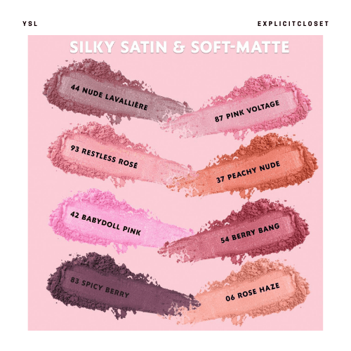 06 ROSE HAZE, 23 Hot Mauve, 37 PEACHY NUDE, 42 BABYDOLL PINK, 44 NUDE LAVALLIERE, 54 BERRY BANG, 83 SPICY BERRY, 87 PINK VOLTAGE, 93 RESTLESS ROSE